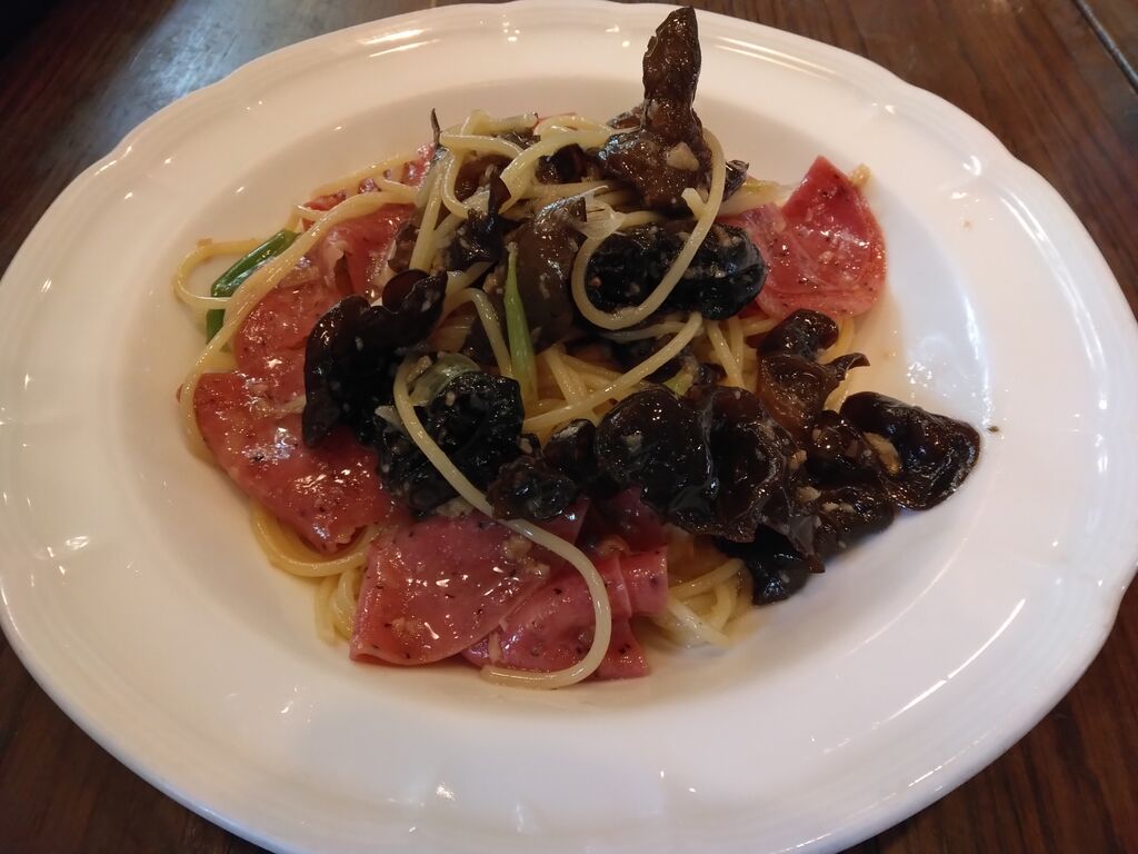 13:20分頃の訪問◉_◉ 入店すると、お店の方が「14:00閉店になりますが、大丈夫ですか!!?」と、聞いてくれました(o゜▽゜)o☆ 急いで食べようということになり、「ペッパーハムと長葱と木耳のガーリック」と、「きのことベーコンとしその和風」のパスタを注文(*Φ皿Φ*) ほぼ同時入店で、自分たちの他に2組いらっしゃいましたが、手際よく、料理が届いていました(o゜▽゜)o☆ 前菜の「サラダ」、続いて、パスタ。細麺にオイルが良く絡んで、物凄い熱々(@ ̄□ ̄@;)!!! 自分は、「きのことベーコンとしその和風パスタ」をいただきましたが、「まいたけ」「しめじ」「エリンギ」と、きのこたっぷりで、嬉しかったな(⋈◍>◡<◍)。✧♡ 「ペッパーハムと長葱と木耳のガーリック」は、少し味見をさせてもらいましたが、ガーリックがとても良く効いて、木耳がコリコリと美味でしたq(≧▽≦q) 食事の途中で、「黒蜜きなこのパンナコッタ」「プリン」「シフォンケーキ」のサンプルをスタッフさんが見せに来てくださり、1種類選べるとのことだったので、「黒蜜きなこのパンナコッタ」を選びました°˖✧◝(⁰▿⁰)◜✧˖° とろ~りとした黒蜜と、濃厚なパンナコッタがマッチしていました(❤️´艸`❤️) ドリンクは、「ウーロン茶」と、「ホットコーヒー」をいただきました(๑•̀ㅂ•́)و✧ 少し駆け足だったけれど、来てみたいと思っていたお店に来られて良かったデス(((o(*゜▽゜*)o))) (訪問:2025/12/01)