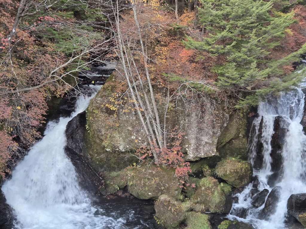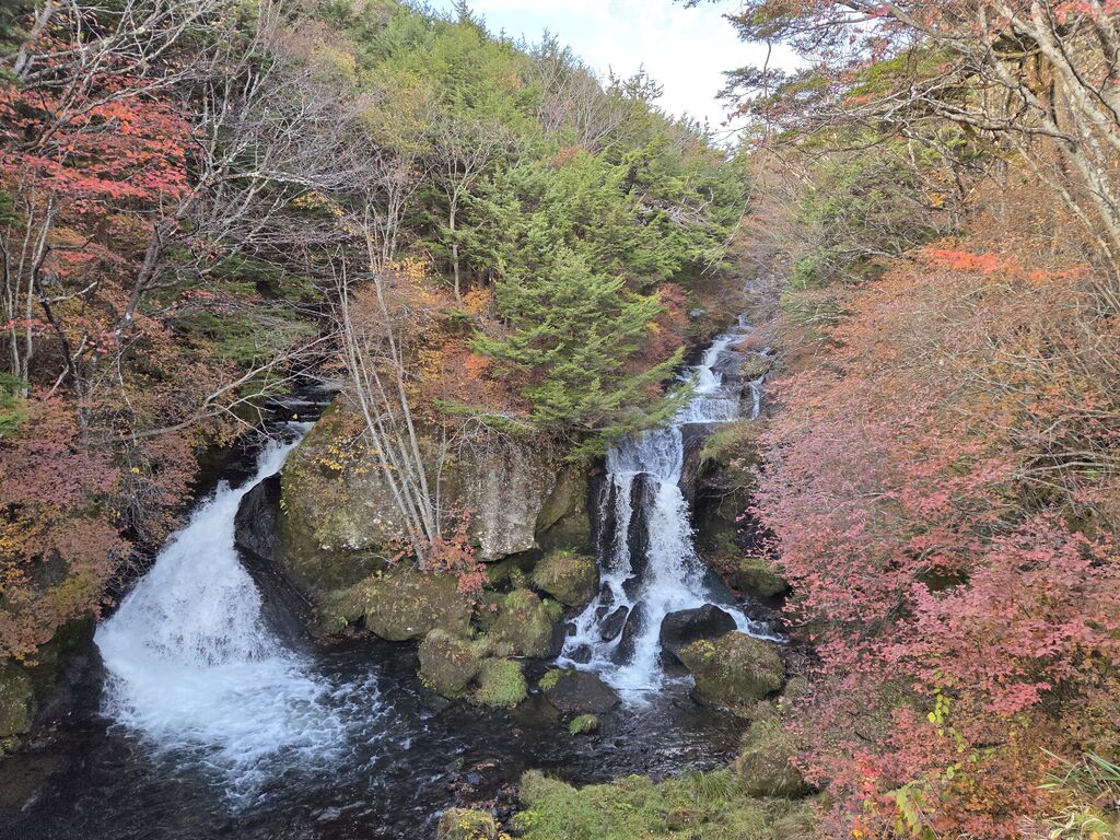 毎年、各地の紅葉情報で登場する竜頭の滝に行ってきました。残念ながら紅葉の見頃は過ぎていましたが、前日雨だったこともあり、2つに分かれて流れる滝の勢いがあり、カッコよかったです。 (訪問:2025/11/01)