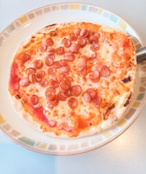 ソーセージのピザ、イタリアンミルクジェラート、ドリンクバーを注文しました。ジェラートは練るとなめらかになります。ミルク感も濃厚で美味しかったです。デザートを食べても合計1000円以下でコスパがいいです。 (訪問:2025/09/21)