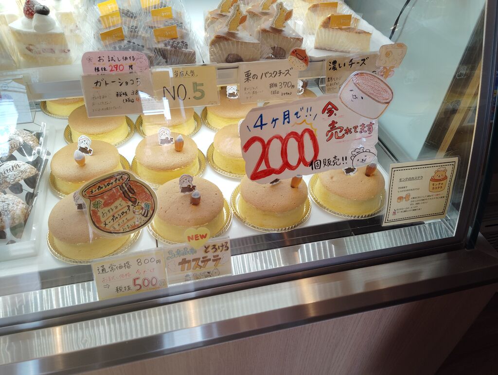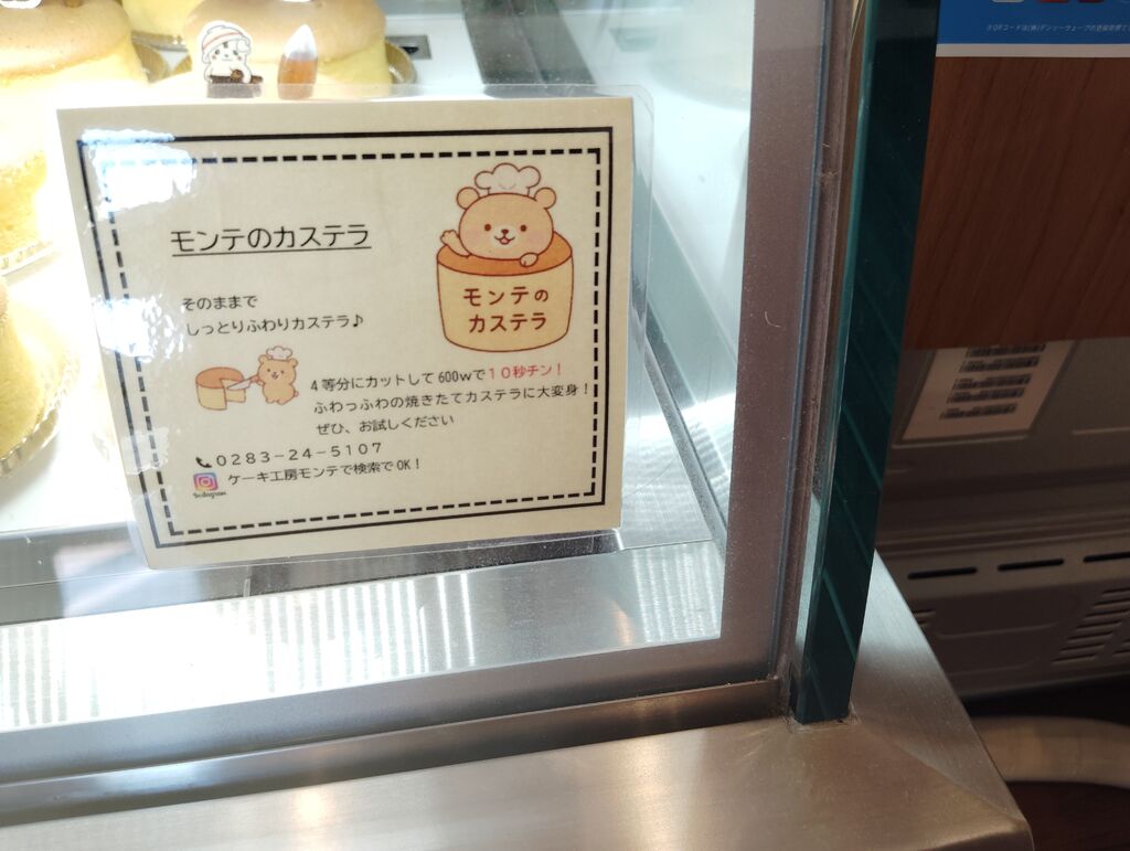 今日は、 佐野市 ケーキ工房 モンテさんに来ました。久しぶりです。店内に入ったら、とろけるカステラ。4カ月で、2000個、販売の文字があり、今、売れてます。ならば、買って食べなくては、と思い購入しました。現在、値段が、800円(税抜き)のところ、500円(税抜き)で、限定価格で、販売されていました。凄くお得感ありますね。しかも、値段も300円引きです。今晩、食べてみますね。その他、いろいろなケーキもありますね。クリスマスケーキのチラシも、スタッフさんから、もらいました。 (訪問:2025/11/30)