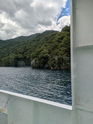 紅葉の時期、遊覧船から観る男体山や湖周囲の紅葉は格別です。遊覧船からは、普段見られない形の男体山も楽しめます。八丁出島(写真2枚目)の紅葉の見頃まではもう少しですが、遊覧船ならすぐそばまで行けて目の前で眺められますよ!紅葉シーズンは乗船する方で行列ができます。時間に余裕もって行かれて、混雑の状態をチェックされることをおすすめします。お天気が良くても、風が強いと欠航もありますのでご注意を。 (訪問:2023/10/16)