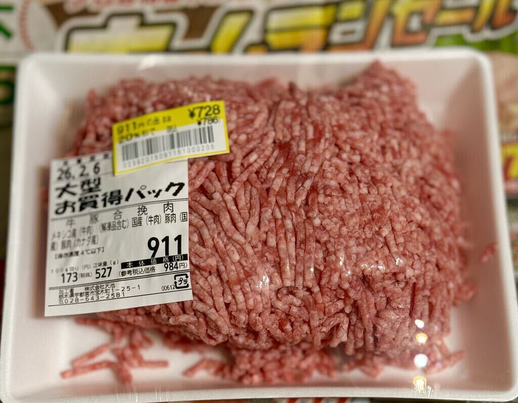ホームランセール開催中のスーパーたいらや宝木店さんへ(*'ω'*)肉の天池さんの精肉「カナダ産 三元豚ロース生姜焼き用」400g本体価格555円♡大型お買得パックの牛豚合挽肉もプライスダウン(*´∀`)お買い得用の新じゃがいもの袋などもありました♪ (訪問:2026/02/05)