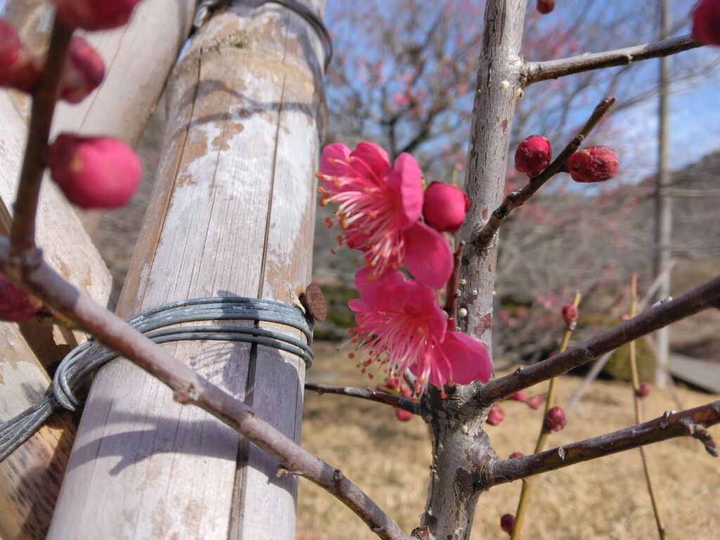 近くを散歩していて、ふと梅は咲いていないかと思い、来て見ました。公園の入り口の紅梅は、一番早く咲きますが、今日は、1月27日ですが、咲き始めていました。これ、公園の少し奥に行くと、フェンス近くにロウバイがあります。こちらは、けっこう咲いていました。やはり、紅梅、白梅は咲き始めで、日の当たるところは、咲くのは早いようです。でも、3種類の梅を見ることができ、とても良かったです。 (訪問:2026/01/27)