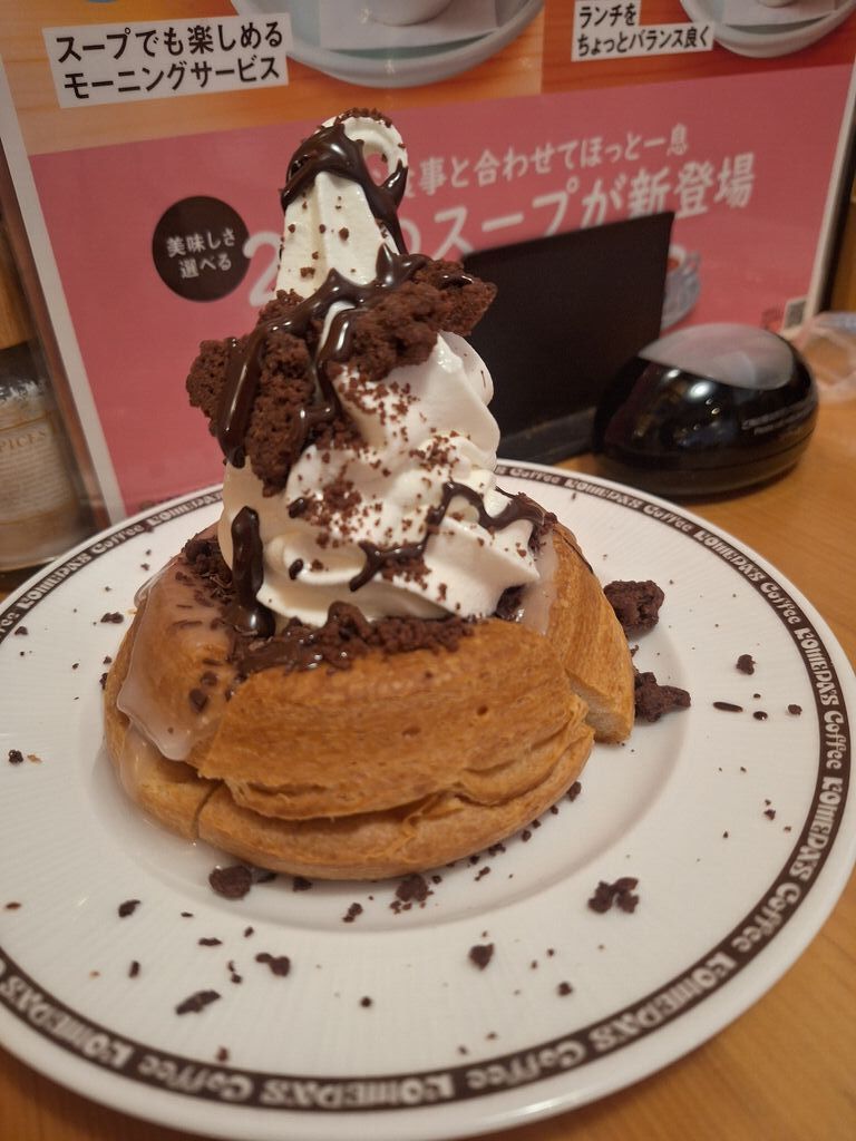 ママ友さんが福袋を購入してチケットを持っているから付き合ってーとランチ訪問☆豊富なメニューに迷いながら、“ミニコメバスケット”に“たっぷりカフェオーレ”に“ミニショコラノワール”をチョイス♪ショコラノワールは、チョコソースが温かいデニッシュの部分はとろ〜り♪ソフトクリームの部分はパリパリ♪クッキーはザクザク♪と食感が楽しく、チョコ好きにはたまりません(^ー^) (訪問:2026/01/30)