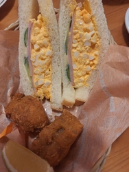 平日13:40頃訪問。平日14時まで注文可の昼コメプレートから、<たまとまレタスサンド>と<カフェインレスコーヒー>を。玉子がたっぷりです!コーヒーもなみなみと注がれていました。木目の温かみがある空間で落ち着きます♪ (訪問:2025/11/20)