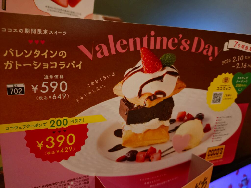 またまた、ココスで、美味しいデザートをいただきました。今回は、いただいた美味しいデザートについて、お話をしたいと思います。いただいた美味しいデザートは、写真に掲載しました通り、バレンタインデーの限定デザートガトーショコラパイになります。ご覧の通り、いちご等のフルーツも添えており、サクサク感の美味しいパイで、濃厚で甘いガトーショコラを挟んだ美味しく、デラックスなデザートです。加えて、ハート型のチョコレートやバニラアイスもついています。とても、コンテンツが充実していて、美味しく、満足したデザートでした。期間限定ですので、皆さんも、是非、食べてみてください。今回も読んでいただき、誠にありがとうございました。 (訪問:2026/02/10)