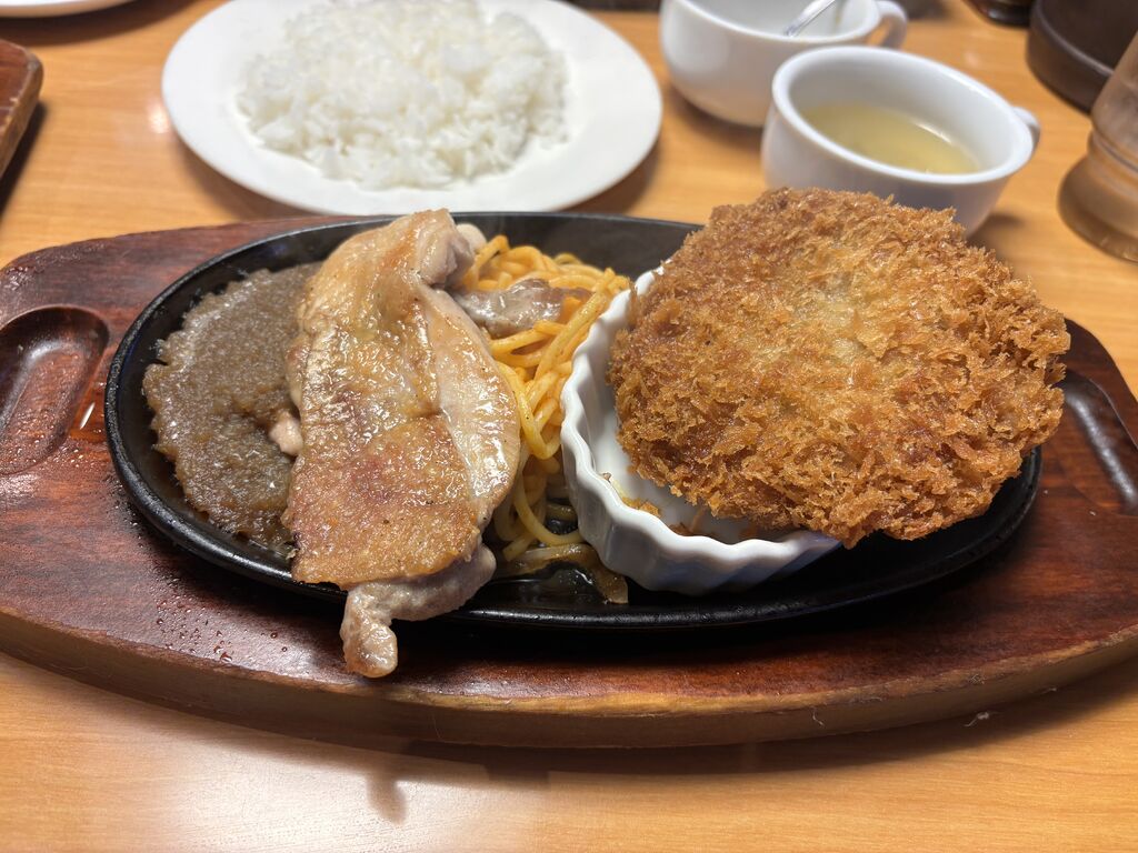 久々に来ました。平日限定ランチ税込¥980(ライスバー、スープバー付)を選択!内容は、チキングリル120g &カニ入りクリームコロッケ、チキングリル120g &牛メンチにしました。さらに、ステーキ宮に来るといつも頼んでしまうランチサラダバー¥649を追加注文。この店、とにかく広いバー周り!1つ1つにゆとりがある。今日のいちおしスープは、春のキャベツとあさりのスープ。柔らかいキャベツと魚介の香りが春らしくて、温かい気持ちになります。サラダバーの季節商品として、パプリカとアスパラのマリネ、菜の花と鶏肉と茄子の黒酢餡、たまごポテトサラダ、紫キャベツマリネ、ベリーゼリーがありました。料理のほうは大きな牛メンチ!熱々クリーミーなクリームコロッケ。チキンは柔らかくてすぐ解れる。やみつきのタレの味付けこそがライスが止まらない原因。多くの店員がテキパキと働いており、みなさん愛想よく丁寧な接客なので食べる側としても気持ちが良いです。提供寸前に、店員さん自らタレをかける演出含め、ステーキ宮ですね。サラダバーに、惣菜やパスタ、スイーツまで揃っているから、期待以上に満腹になることができました。 (訪問:2026/04/07)