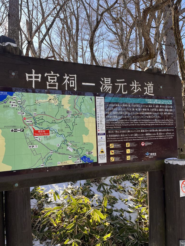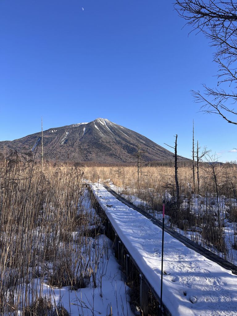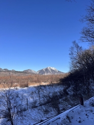 天気は雲ひとつない快晴。せっかくなのでトレッキングをしようと、戦場ヶ原 まで足を延ばし、雪道を歩いてきました。赤沼駐車場 から 小田代原 までのコース。風もほとんどなく、本当に気持ちのいいトレッキングでした。目の前には 男体山、そして冬の湿原。静けさの中に広がる景色は、なんとも神秘的です。暗くなる前に無事周遊できてひと安心。ほどよい疲労感を感じながら、本日の宿へ向かいます。 (訪問:2025/12/28)
