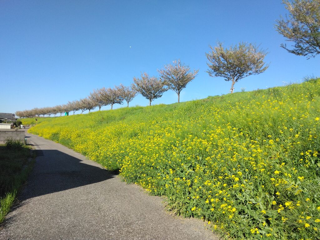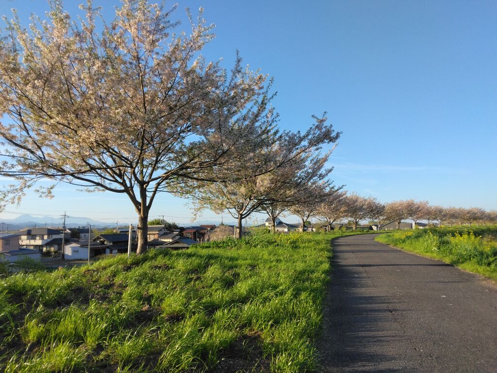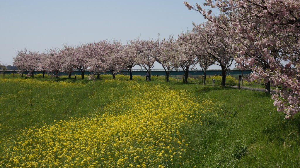 思川沿いに続く堤防上には、桜の里親制度により思川桜1,000本以上が植栽されています。堤防の法面には菜の花も群生し、春の散歩コースにおすすめです♪