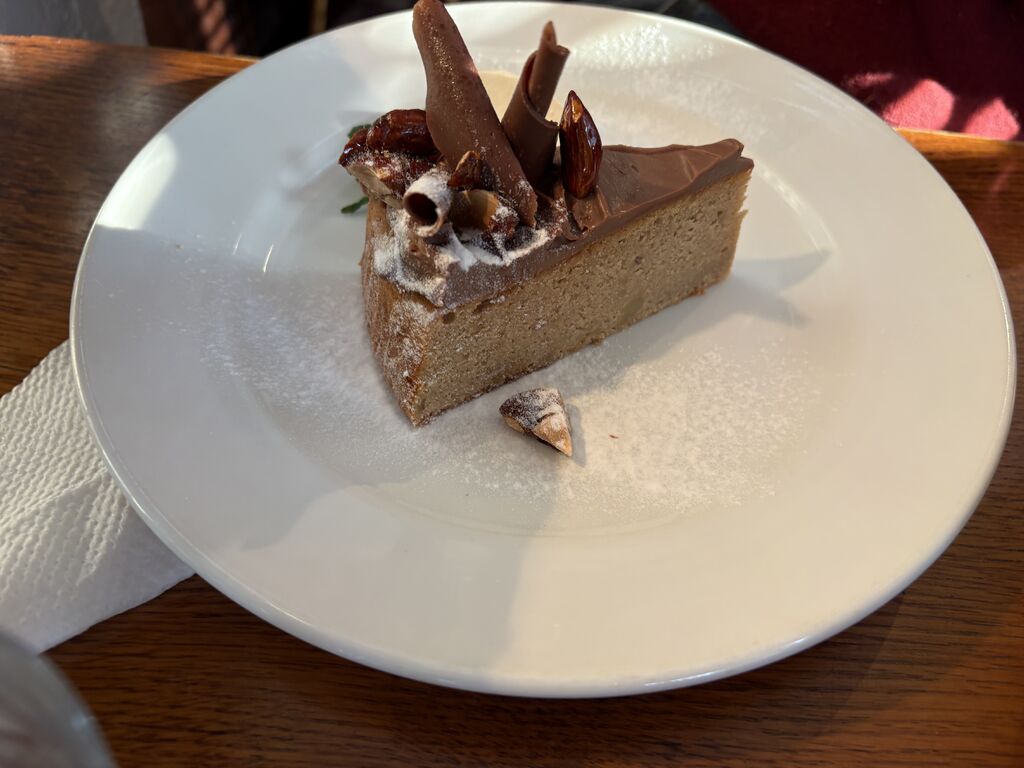 NEW久しぶりに伺いました。今日はカフェ利用です。カフェタイムでもたくさんのお客さんです。ケーキセット1300円です。数種類のケーキから選んだのは焼きリンゴのタルト、相方は栗のチョコレートケーキ。ドリンクは本日のコーヒーです。リンゴのタルトの上に小さなアイスがのっています。リンゴの甘さがちょうどよくアイスで口の中がさっぱりします。 (訪問:2026/01/18)