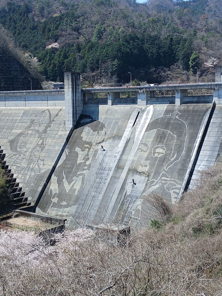 今日は、4月3日(金)の平日です。昨年桜を見に来てとてもきれいだってので、今年も見に来ました。イヤーとてもきれいです。満開で風が吹くたび、花が散り始めていました。ところが、ダムを見ると、巨大なサムライの絵が、目の前に現れ、驚きとそこで絵を描いている姿を見て、「イヤーなにこれ、とんでもなくスゲー。」と、言葉が出てしまいました。桜とダムのとんでもアート、超最高でした。 (訪問:2026/04/03)