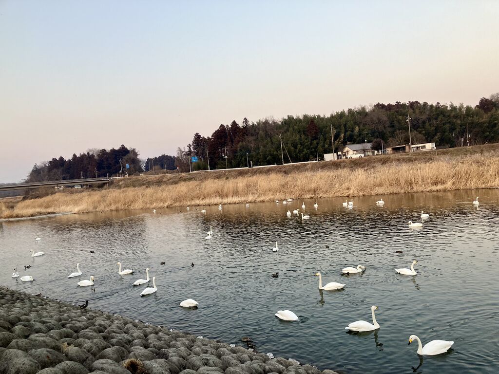 | 広い河川敷からの眺望 | 天気が良ければ元旦には白鳥の背景に筑波山と初日の出が楽しめます。 |