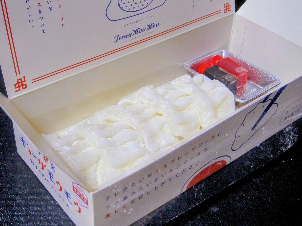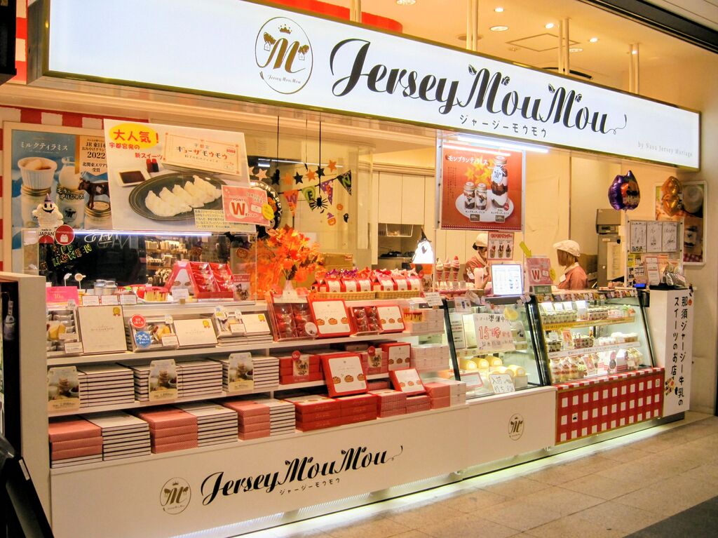 TVで紹介されたのを観て…食べたい!是非とも食べてみたい!絶対に食べたい!…逸る気持ちを抑えつつの初来店です(*^^*)。。。場所も確認しないでの突撃だったので、現地でキョロキョロ!ネットで検索しましたが場所が良くわかりません(ToT)。。。2Fのコンコースに有るはずと見当をつけて突撃だったのですが迷子状態です(;_;)。。。迷った挙げ句にふと、振り返るとそこに『Jersey Mou Mou』さんが有りました(^-^)ゝ゛。。。来店の目的は こ・れ!…【宇都宮ギョーザモウモウ¥1380】どこか?懐かしい色合いとデザインのパッケージ!、一目で中に何が入っているか想像できます!…箱を開けると大振りの餃子が五つ!タレとラー油も入っています(*^^*)。。。でもこれ、Jersey Mou Mouさんが宇都宮餃子会とコラボした餃子型スイーツなんですよねぇ(^o^)/。。。那須ジャージーミルクから作ったミルクティラミスクリームを求肥で包み餃子型に成形しスイーツ!醤油イメージのエスプレッソソースと ラー油イメージした苺ソース!お箸とソース皿まで付いています(*^^*)。。。妻と二人で頂きましたが…( •̀ω•́ )૭✧ウマイ。。。『Jersey Mou Mou』さんには他のスイーツも沢山有りました(^o^)/。。。中でも「宇都宮ギョーザモウモウ」は特にお勧めです( ^-^)ノ∠※。.:*:・'°☆ (訪問:2025/10/14)