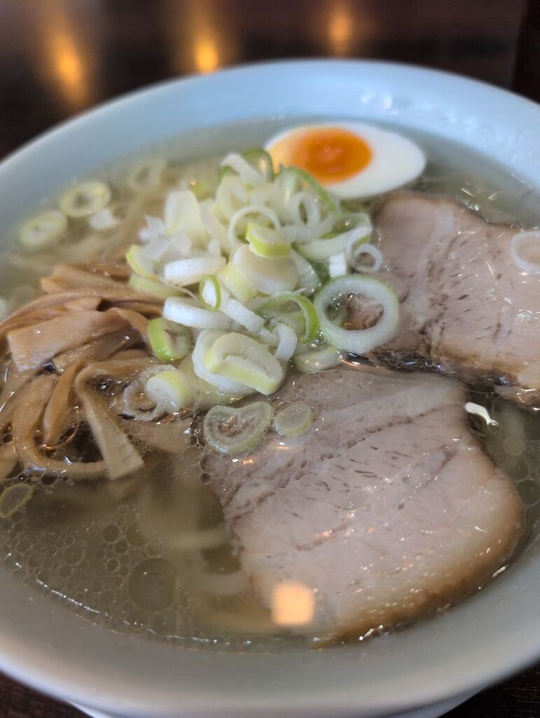 お昼ご飯を悩んでFKDにいるならやはりとし食堂さんで。いつも冷たい麺ばかり食べていましたが、今日は喜多方塩ラーメンにしました。ネギだっぷりですね。キラキラの塩スープに縮れた麺と細いメンマがマッチ。スルスル頂きました。まだ冷やし中華はあるそうです。 (訪問:2025/09/17)