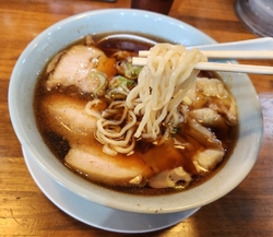 NEW初訪問です。塩か醤油か悩んで店員さんにオススメを聞いて「喜多方塩ワンタン麺」を注文。5分程で運ばれてきました。スープは透明でも味がしっかりあり、麺とよく合います。チャーシューは厚めで柔らかく、ワンタンも美味しかったです。一滴も残さず飲み干しました。 (訪問:2025/10/07)