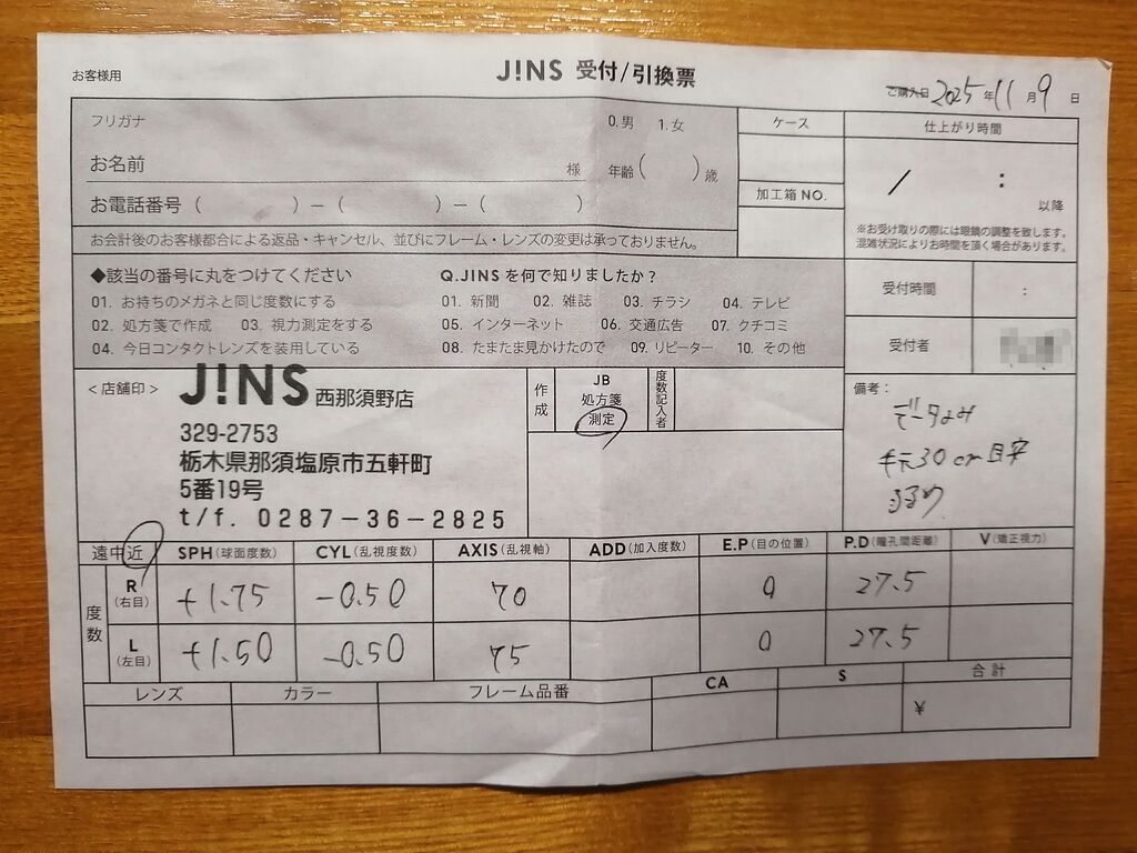 友人が「フレームが曲がっちゃったからJINSに行きたい」…と言うので一緒にお伺いしました。私は検診のたび視力の低下が気になっていたし老眼も進んでいると感じていたので店員さんにその旨を伝えると目の状態の検査をしてくれました。左右の視力の違いと乱視がある…とのこと。自分の目に合ったメガネを使用する大切さを友人と店員さんから説明されメガネを作ることにしました。今日は時間がなかったので検査した紙を持って後日また伺いたいと思います。友人の曲がったフレームは無事に元通りになりました。ありがとうございました(˶ᐢᴗᐢ˶) (訪問:2025/11/09)