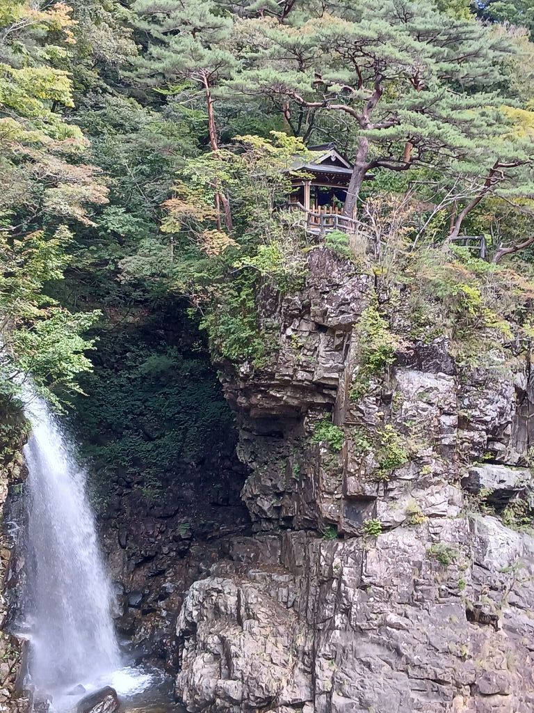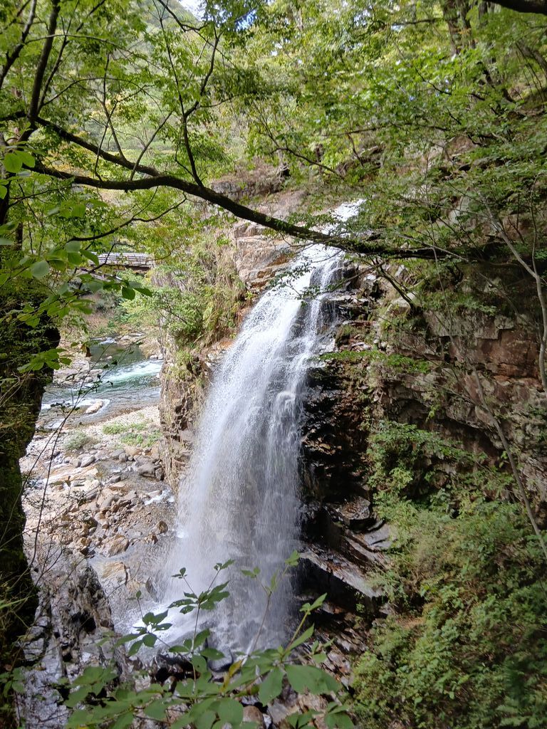 NEW今日は、10月6日(月)の平日です。この滝は、駐車場から近いのですが、かなりの下り坂を下りると、見ることができます。下りる途中に神社があり、そこから見る滝と、坂を下り切ったところにある吊り橋から見る滝とありますが、どちらも見ていて迫力があります。吹く風は冷たいのですが、まだ紅葉は先のようです。 (訪問:2025/10/06)