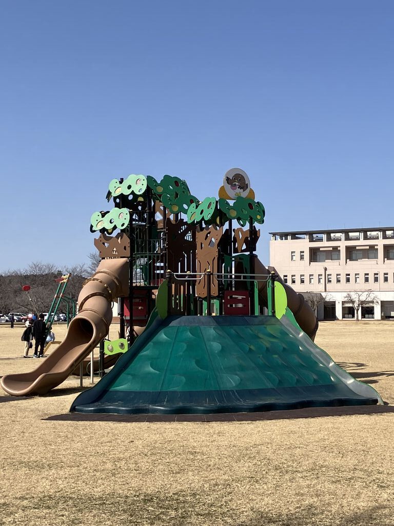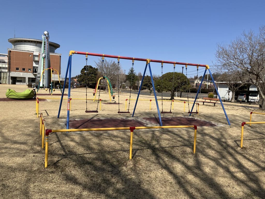 市貝町役場南側にある広大な芝生の広場です。扇形の滑り台などの遊具を組み合わせた大型遊具をはじめ、弓形のシーソーやターザンロープなど10基ほどの遊具、ジョギング・ランニングコース等もあります!様々なイベントの会場としても利用されています。