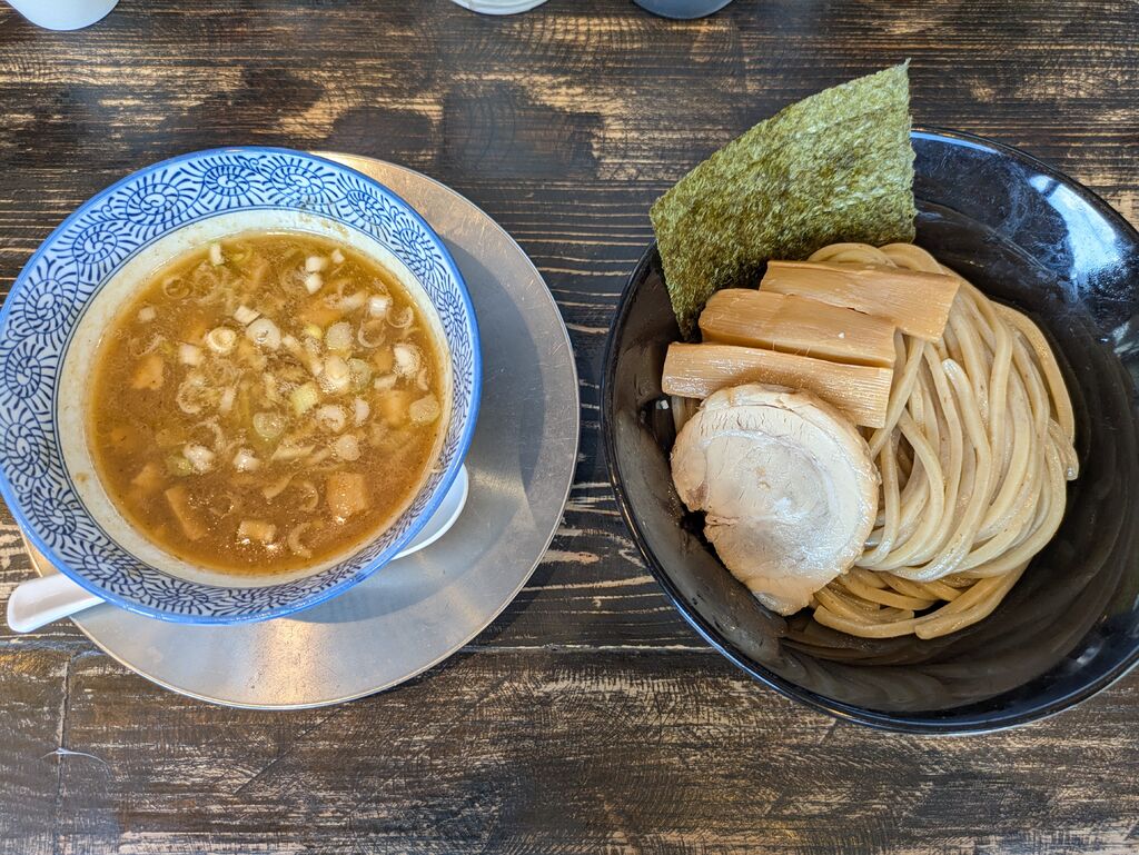 定期通院後のお昼に、豚のオオモリ製作所さんへ。本日から販売開始になった、G系昆布水つけそば。粘りある昆布水に極太ワシワシ麺、G系スープも次第に昆布水が混ざり合いマイルドな味に!美味しかったです! (訪問:2025/07/25)