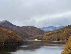 湖畔2か所からの眺めです。満々と水をたたえた湖面は所々エメラルドグリーンの色に見え綺麗でした。川俣大橋が小さく見える場所では14艘のボートが停泊され今年の釣り期間が終わったことを示しております。紅葉の進み具合は湖の標高、日向、日陰の場所で違っていて水域の広さが感じられました。 (訪問:2023/10/21)