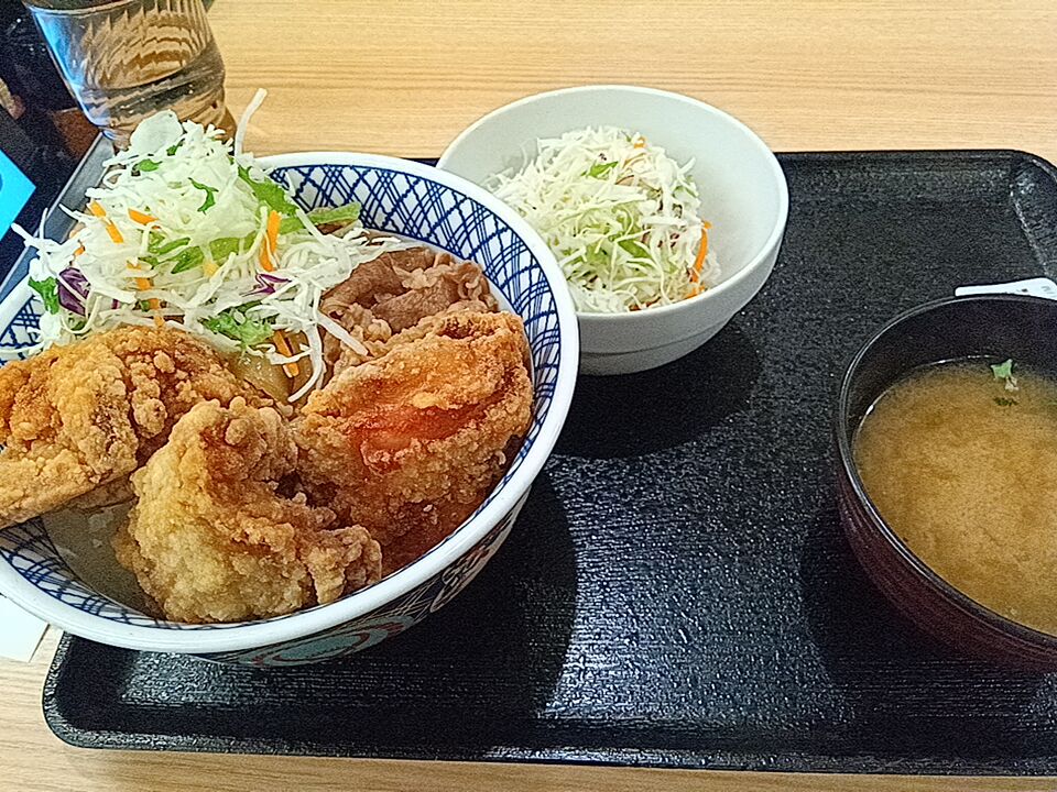 年末の大掃除終わりで、遅めの昼食に伺いました。気になりつつ注文していなかった牛黒カレー(ご飯増量)にサラダ・味噌汁セットです。吉野家さんの味噌汁は風味が良いです。牛黒カレーは牛丼・カレーの両方が楽しめます。カレーは甘めですが、紅生姜が良いアクセントになりました (訪問:2024/12/29)