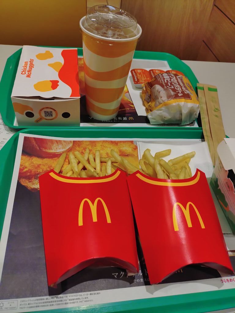 お昼に、マクドナルドのセットメニューをいただきました。今回は、いただいたセットメニューについて、お話をしたいと思います。いただいたセットメニューは、ダブルチーズバーガーセットと15個入りチキンマックナゲットです。ダブルチーズバーガーのセットは、マックフライポテトはL,ファンタメロンはMです。マックフライポテトのLは必ず頼みます。それほど、美味しいのです。私はLです。常にLです。チキンマックナゲットのソースは全種類バーベキュー味です。食べごたえ十分なチーズバーガーに加えて、多くの味を楽しめるチキンマックナゲットは最高の組み合わせです。満足した昼食でした。皆さんも、是非、食べてみてください。 (訪問:2025/12/30)