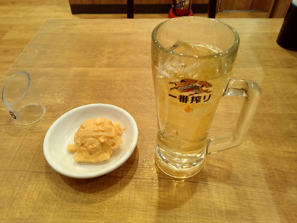 ちょい呑みしたくて、ふらっと寄りました。餃子3個と唐揚げ3個と中ジョッキ。手元のタブレットで注文。シンプルな美味しさと量で、ビールにちょうどいいですね。次は、麺類なども食べてみたいです。 (訪問:2025/12/24)
