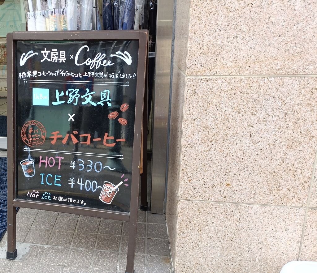 上野文具本店内☆チバコーヒーのオリジナルブレンド豆を使用した、こだわりのコーヒーがテイクアウト限定で楽しめます!香り高く、味わい深い一杯をご用意しております。お買い物の合間に心ほどける特別なひとときをどうぞ♪