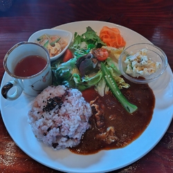 今日は息子の友達も連れてランチに来ました。息子と友達はナポリタン。私はたまにハヤシにしてみました。アイスティーも忘れずに。盛り付けが、まず目から楽しい。そして美味しい。アイスティーは、注いで氷が溶けるのが、すごく涼しげでイイです。 (訪問:2025/07/28)