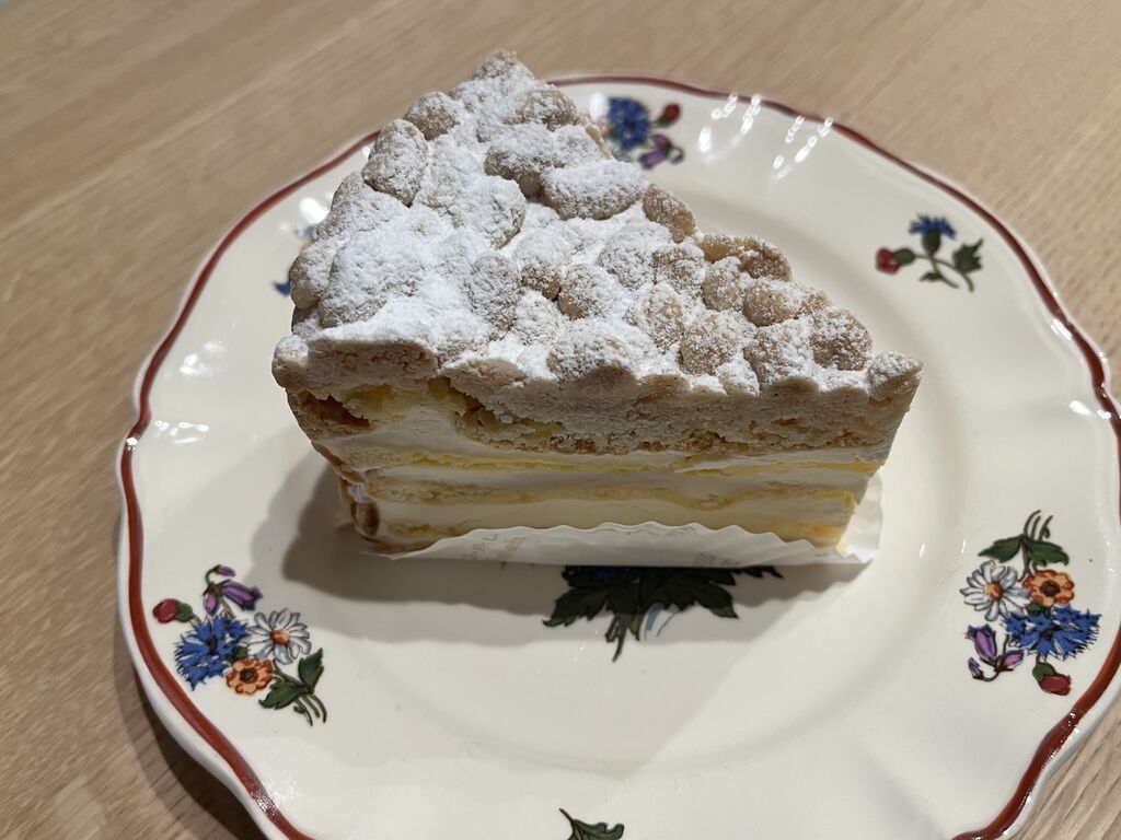 ユーハイムさんで大好きな「フロッケンザーネトルテ」を購入しました。タルト生地にシュー生地のミルフィーユ。上にはザクザクのクランブル生地。側面にはアーモンドスライス。生クリームも上品で香りが良く、大変美味しいです。こんな凝っているケーキはなかなか他では売ってないので、ぜひ一度食べてみてほしいです。おすすめ。 (訪問:2025/12/29)