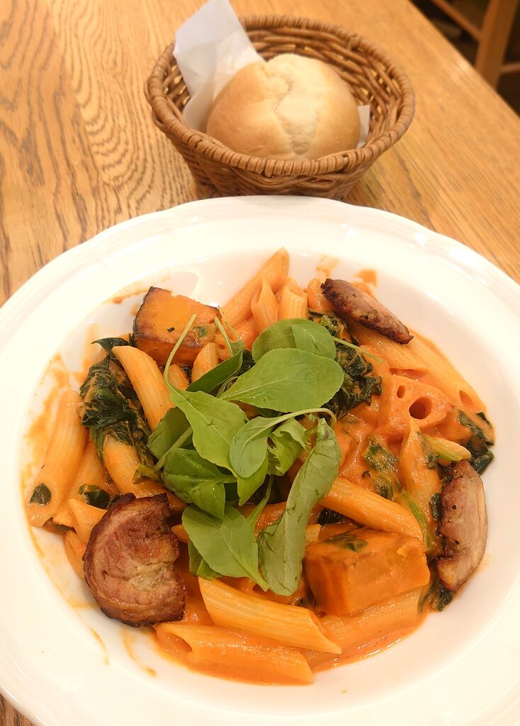 アフタヌーンティーさんにランチに伺いました!季節限定スパイシーチキンとほうれん草のトマトクリームペンネのパン付き、そして飲み物はディカフェのアールグレイ!スイーツも季節限定の栗とむらさき芋のショートケーキを別にオーダー!オーガニックトマトの優しいトマトクリームに、スパイシーチキンとほうれん草、かぼちゃ、レンコンが入って、とても美味しいペンネです!パンもいつもふわふわ美味しいです!栗とむらさき芋のショートケーキは、チョコスポンジに、むらさき芋とマロンクリームが両方使われていて、贅沢なとても美味しいケーキ!紅茶と食後をゆっくり楽しみました!テーブルには秋いろの可愛らしいお花、そして入り口のレジ近くには秋の焼き菓子、ギフト商品、カレー、パスタソース、紅茶等々素敵な商品が販売されていました!秋を満喫したランチ、とても美味しかったです!季節を感じられる素敵な時間を、いつもありがとうございます!ごちそうさまでした! (訪問:2025/09/19)