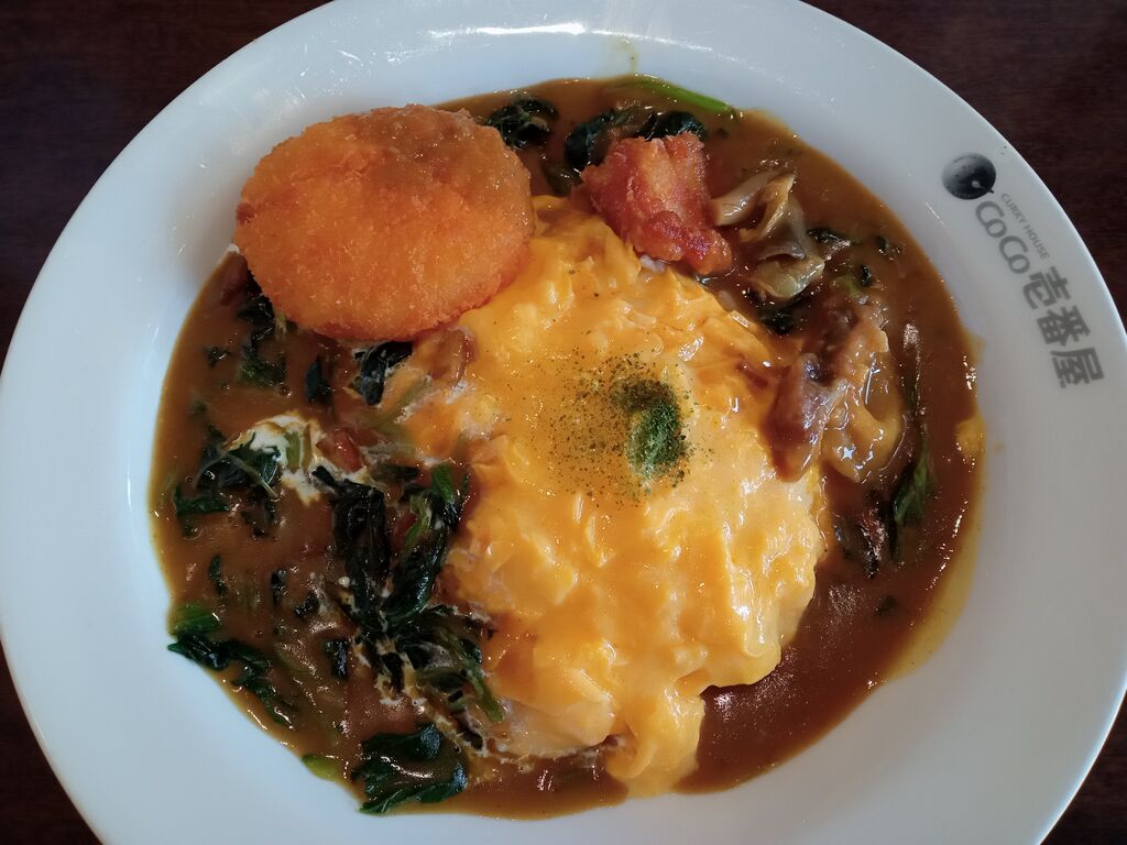 海の幸カレーにほうれん草、クリームコロッケ、スクランブルエッグトッピングです。ライスは150グラムにしました。ハマっています。 (訪問:2026/03/12)
