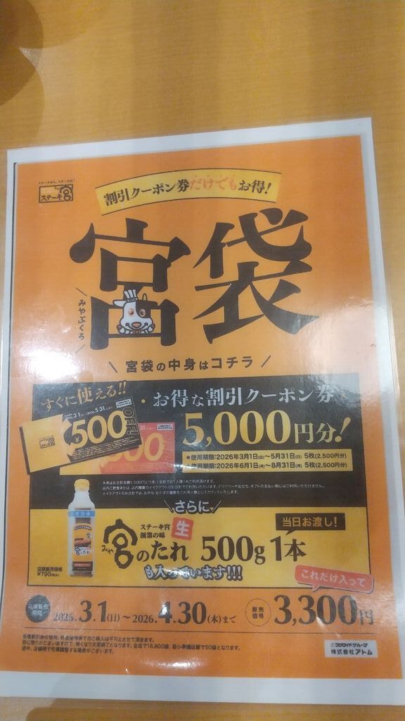 久しぶりのステーキ宮に来ました。いつの間にかスマホで注文出来るようになっていました。宮袋と言う名の、福袋も4月30日迄販売していますので沢山利用される方はお得だと思います。 (訪問:2026/03/16)