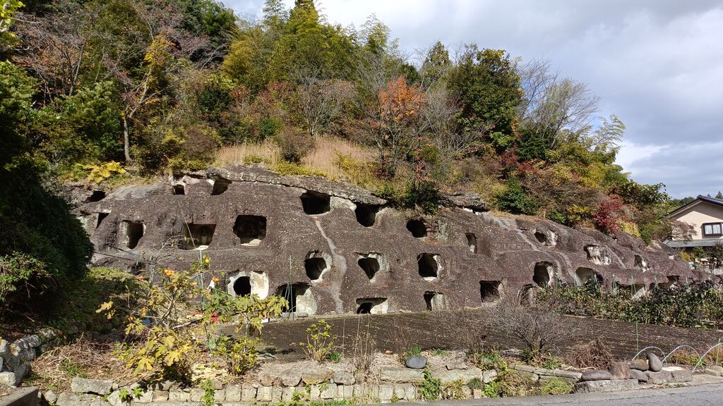 【県指定史跡】岩の斜面に掘り込まれた52基の横穴群は圧巻です。