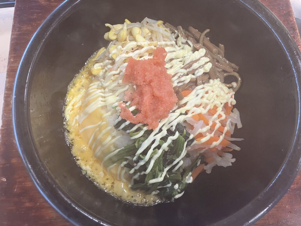買い物でお昼を過ぎていたので、ランチにいただきました。キムチビビンバ(石焼)780円を注文しました。2種類の調味料ヤンニョムとコチジャンがおいてありで自分の好みに味付け出来るのは良かったです。 (訪問:2024/09/16)