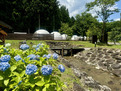 グランピング施設内の滝の見えるカフェ