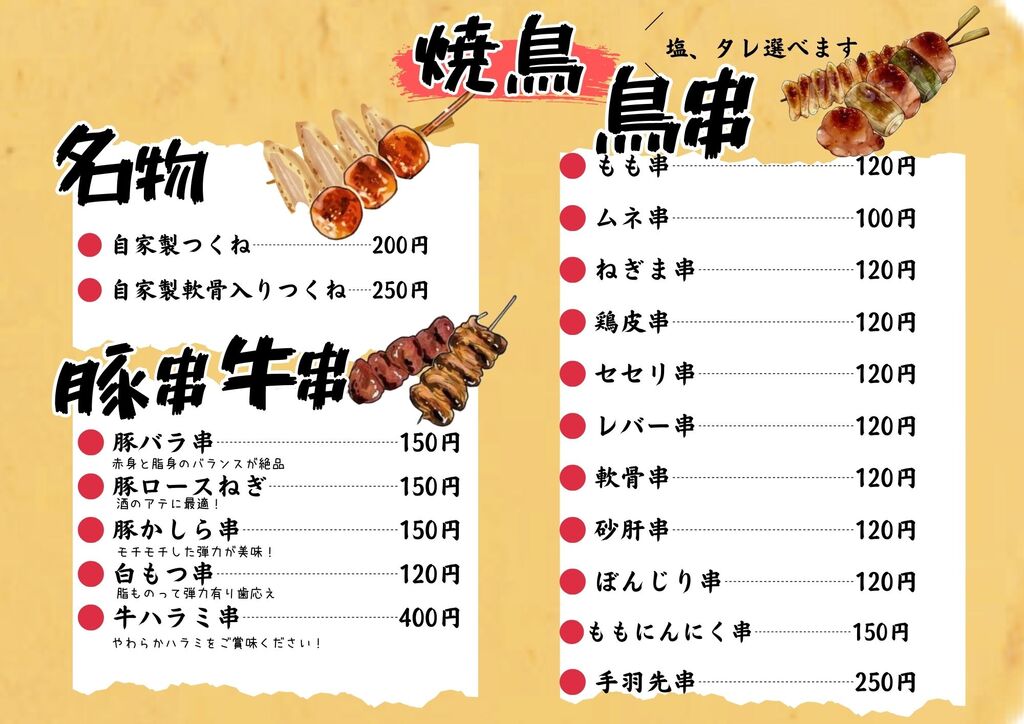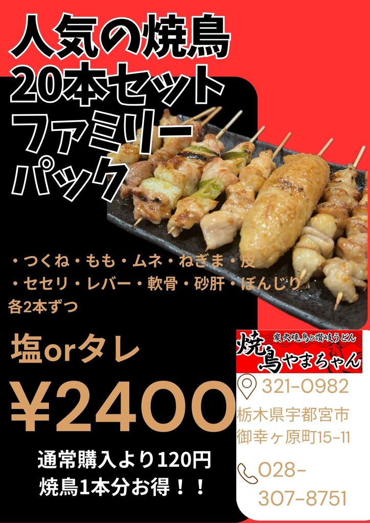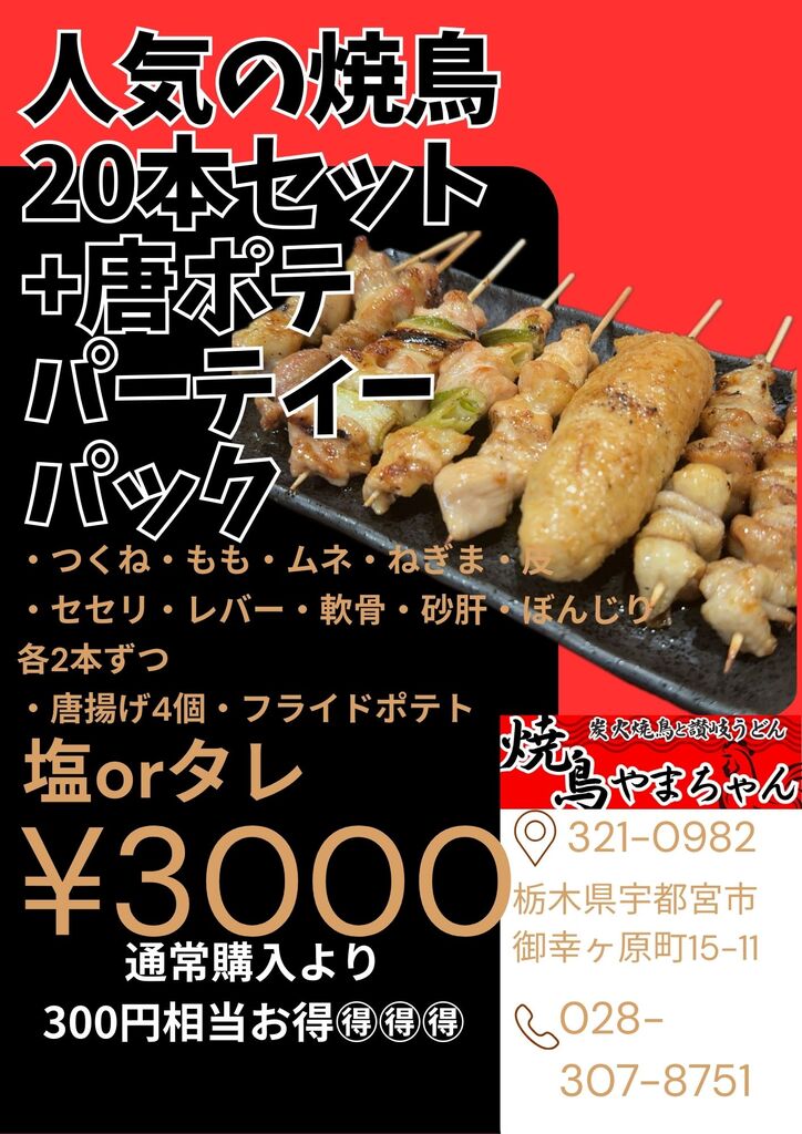 宇都宮市の焼き鳥・串焼き・やきとり・うどん・テイクアウト クチコミ8件 ヤキトリヤマチャンサヌキウドンドンウイザカヤヤマチャン 焼き鳥やまちゃん/ 讃岐うどんDONU/ 居酒屋やまちゃん 028-307-8751 028-307-8751 お気に入り クチコミする ネット予約する 基本情報 メニュー・クーポン クチコミ 写真 地図 最新情報 コース一覧 メニュー一覧 テイクアウトメニュー一覧 テイクアウトメニュー一覧 やきとりテイクアウトメニュー お得な焼鳥20本盛り合わせ 焼鳥20本盛り合わせ+唐揚げ+ポテト お弁当メニュー 焼鳥8本盛り合わせ1000円 コース一覧 メニュー一覧 テイクアウトメニュー一覧 栃ナビ! 栃木県のお店・スポット情報 食べる 居酒屋・バー 焼き鳥・串焼き 焼き鳥やまちゃん/ 讃岐うどんDONU/ 居酒屋やまちゃん テイクアウトメニュー一覧