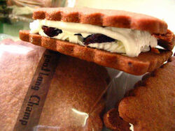 ちょっと今ふうの、新感覚のレーズンサンドです。普通のレーズンサンドは、皮がねっとりしてますが、これはサクサクとても軽快な食感です(しかも皮はカカオ味♪)中のクリームにもブランデーを入れ、レーズンは、ラムとナポレオンに2ヶ月くらい漬け込んだものを使っています。ピリッと辛口で、でも軽い後口がしゃれた感じの一品です。