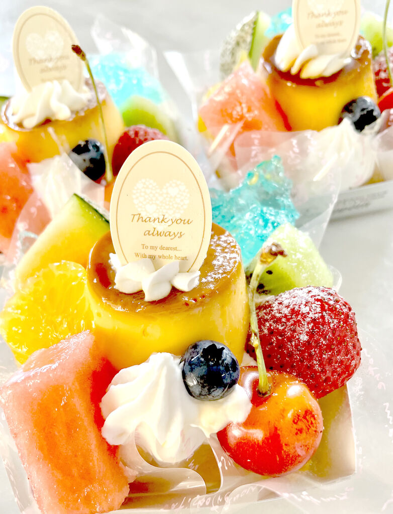 ミニサイズのプリンを中心に、6~8種類くらいのフルーツ。
