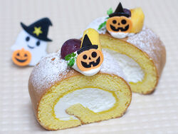 かぼちゃ味のカステラスポンジで、北海道産49%の生クリームと、かぼちゃのムースを巻きました。