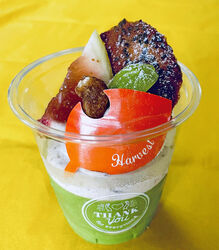 カップの中には生クリームとカスタードクリーム、スライスしたザッハトルテ(チョコ)が入っています。