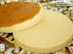 丸い形のスポンジです。卵黄たっぷり、甘くてふわふわ、とてもオイシイです(^-^) サンドもできるように、二つに上下をカットしてお渡しします。