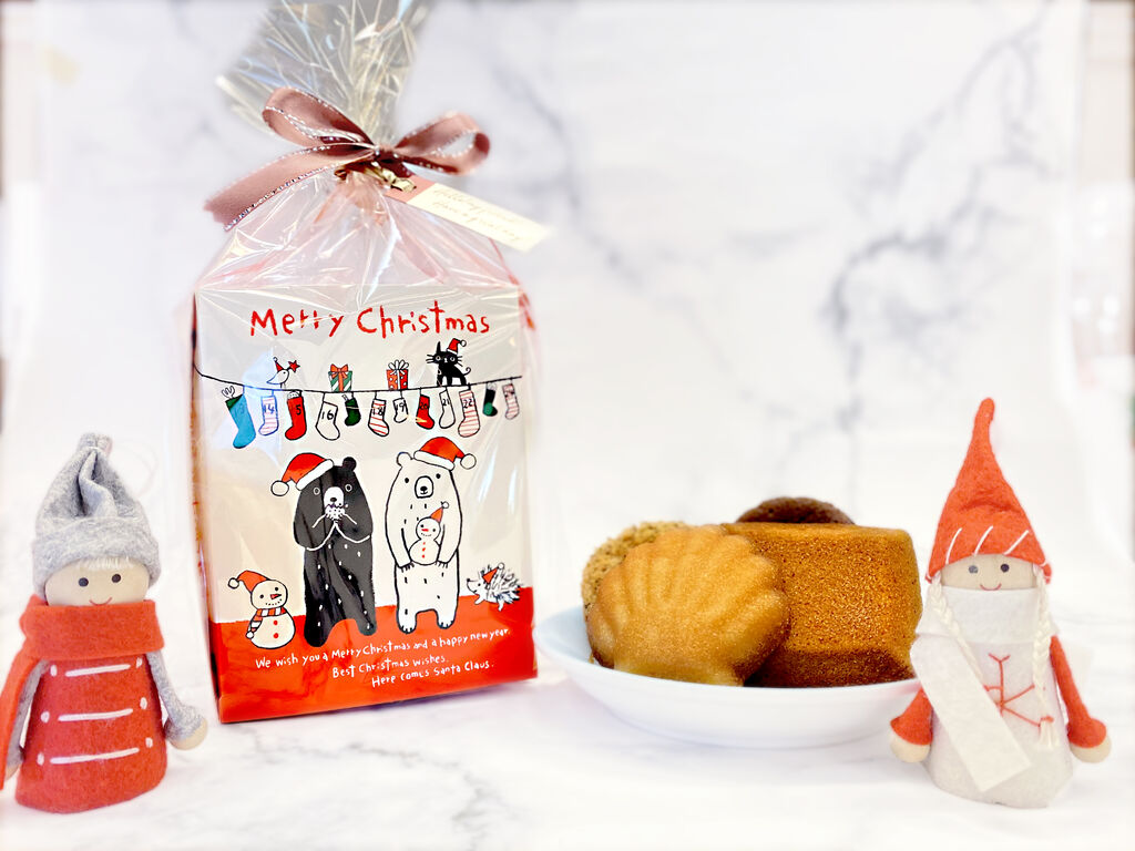 この時期は、クリスマス柄の可愛い袋に入ったお菓子と、クリスマスムード漂うラッピングで、スペシャルなムードを演出しています。