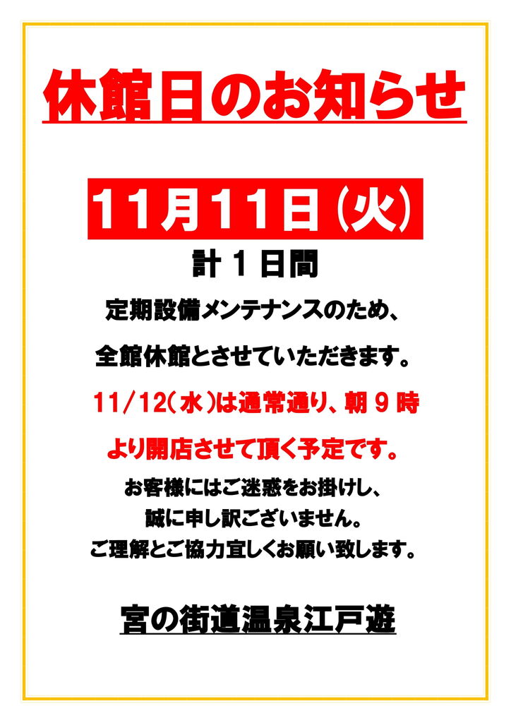 宇都宮市の温泉(日帰り)・銭湯・スーパー銭湯・マッサージ・漫画喫茶・ネットカフェ クチコミ112件 ミヤノカイドウオンセンエドユウ 宮の街道温泉 江戸遊 028-612-4126 028-612-4126 お気に入り クチコミする 基本情報 メニュー・クーポン クチコミ 写真 地図 最新情報 求人 宮の街道温泉 江戸遊の最新情報 絞り込む ----- お知らせ 予約状況 臨時休業 クーポン 誕生日・記念日 イベント セール情報 テイクアウト 新サービス キャンペーン 求人情報 秋限定ニュース ハロウィンニュース 感染対策 ネットショップ 臨時休業 11/11(火)休館日のお知らせ(25/10/14) 11月11日(火)は、定期設備メンテナンスのため、全館休館とさせていただきます。11月12日(水)は通常通り9:00開店予定となります。お客様にはご迷惑をおかけし、申し訳ございません。 "ぐッ"ときた! 0人 1 マイニュースに追加 お店・スポット最新情報 栃ナビ! 栃木県のお店・スポット情報 遊ぶ 温泉・銭湯・サウナ 温泉(日帰り) 宮の街道温泉 江戸遊 ニュース