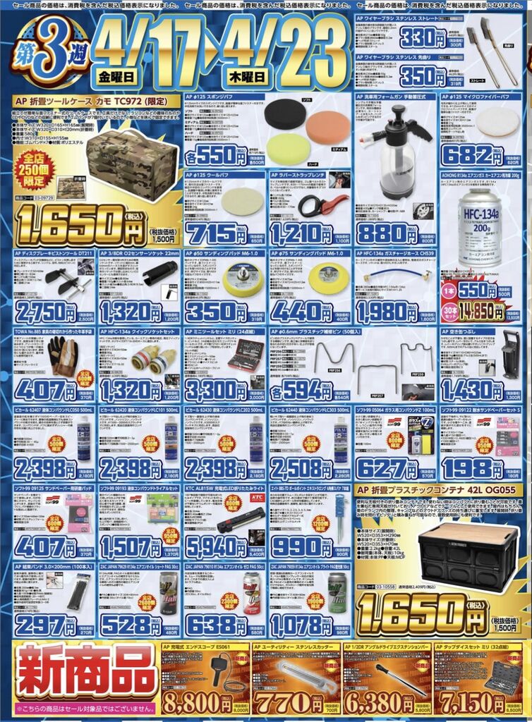 オイル廃棄ボックスやウエス、ワックスなどが毎日安いですよ。
