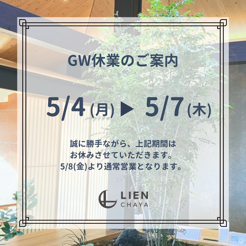 GW★SPECIALニュース 【リアン茶屋】GW休業日のお知らせ(26/04/24) NEW