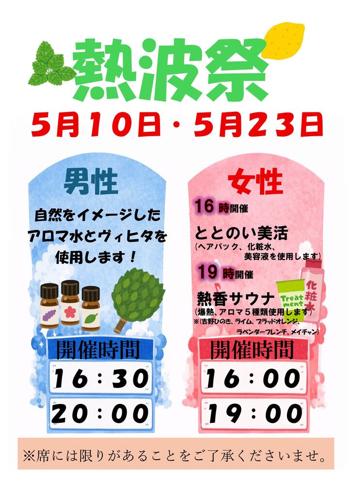 イベント 5月10日(日)・5/23(土)は大人気スタッフ熱波イベント開催(26/04/25)
