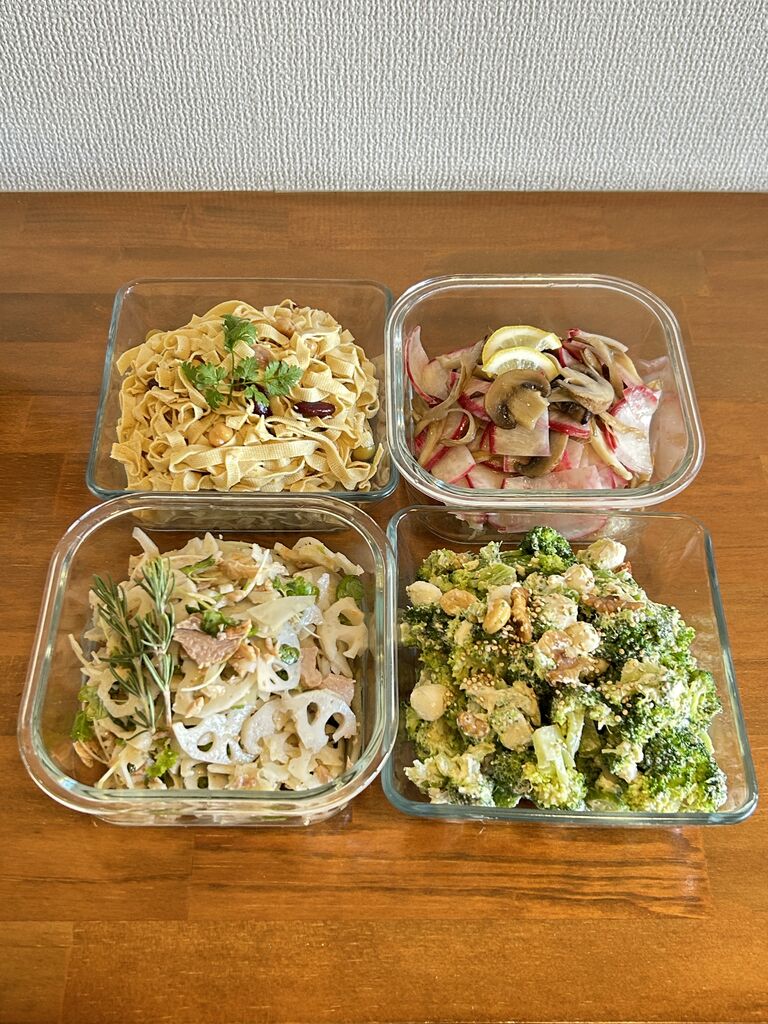 少なめパスタ、サラダ、自家製パン、ミニデザートのセットです。