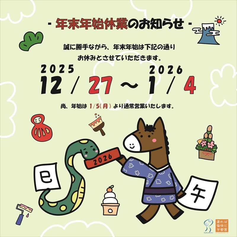 宇都宮市の屋根・外壁・内壁塗装・リフォーム クチコミ1件 サカモトトソウカブシキガイシャ 坂本塗装株式会社 028-635-4533 028-635-4533 お気に入り クチコミする 基本情報 メニュー クチコミ 写真 地図 最新情報 坂本塗装株式会社の最新情報 絞り込む ----- お知らせ 予約状況 臨時休業 クーポン 誕生日・記念日 イベント セール情報 テイクアウト 新サービス キャンペーン 求人情報 クリスマスニュース 年末年始ニュース 忘・新年会ニュース 感染対策 ネットショップ 年末年始ニュース 坂本塗装 年末年始休業のお知らせ(25/12/23) NEW よろしくお願いします! "ぐッ"ときた! 0人 1 マイニュースに追加 お店・スポット最新情報 栃ナビ! 栃木県のお店・スポット情報 くらす 住宅・ガーデン・不動産 屋根・外壁・内壁塗装 坂本塗装株式会社 ニュース