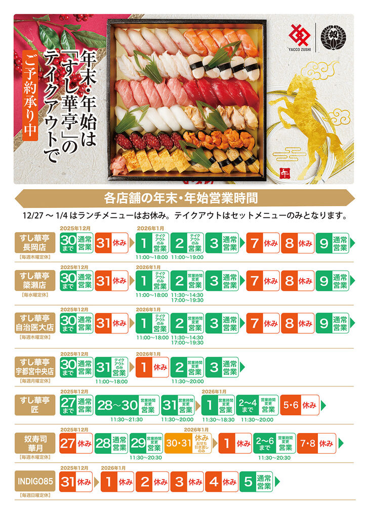 宇都宮市の寿司・テイクアウト・和食・うなぎ クチコミ20件 スシハナテイタクミ すし華亭 匠 050-7586-3892 050-7586-3892 お気に入り クチコミする 基本情報 メニュー クチコミ 写真 地図 最新情報 すし華亭 匠の最新情報 絞り込む ----- お知らせ 予約状況 臨時休業 クーポン 誕生日・記念日 イベント セール情報 ランチ ディナー テイクアウト 飲み会・宴会 新サービス キャンペーン 求人情報 クリスマスニュース 年末年始ニュース 忘・新年会ニュース 感染対策 ネットショップ 年末年始ニュース 年末年始の営業カレンダー(25/12/23) UP 年末年始の奴寿司グループの営業カレンダーになります。12/27~1/4まではランチメニューお休み。テイクアウトはセットメニューのみとなります。 "ぐッ"ときた! 0人 1 マイニュースに追加 お店・スポット最新情報 栃ナビ! 栃木県のお店・スポット情報 食べる 和食 寿司 すし華亭 匠 ニュース